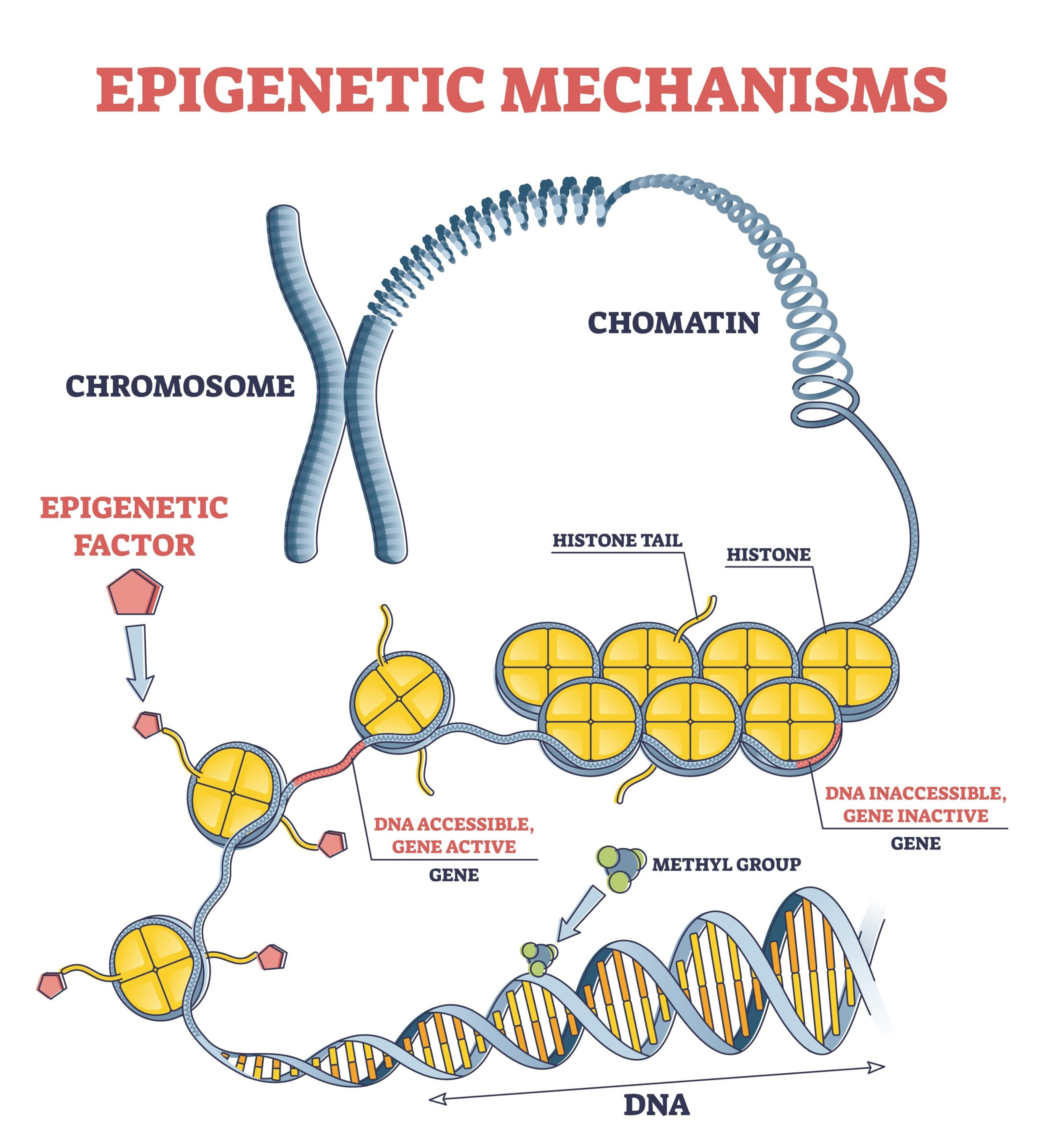 Si la génétique est la partition (le texte d’ADN), l’épigénétique est l’interprétation qu’en fait le musicien. Les notes ne changent pas, mais selon l’environnement, le chef d’orchestre peut décider de jouer certains passages fortissimo ou, au contraire, de mettre en sourdine certains instruments. Concrètement, l’épigénétique étudie les mécanismes qui modifient l’expression de nos gènes sans changer la séquence d’ADN elle-même. Ces modifications agissent comme des « interrupteurs » chimiques (appelés groupements méthyles) qui activent ou désactivent certains gènes en fonction de notre mode de vie.